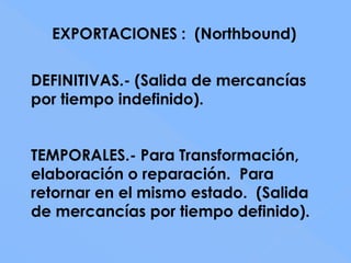 Este documento proporciona información sobre exportaciones e importaciones, incluidos los tipos de exportaciones, la documentación requerida para el despacho aduanero, los gastos asociados y las franquicias para pasajeros internacionales. Explica los conceptos de exportación definitiva y temporal, los documentos necesarios como facturas y permisos, y los costos de impuestos, derechos y honorarios de agentes aduanales. También cubre la ventanilla única y las modificaciones al puente internacional entre Pharr y Reynosa.