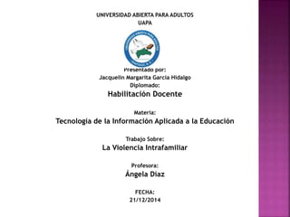 El documento aborda la violencia intrafamiliar, definiéndola como el abuso de poder dentro del hogar, que incluye maltrato físico, psicológico, sexual y económico. Se discuten sus causas, que suelen estar asociadas a problemas sociales y psicológicos del agresor, y se plantea que la educación y la concientización son fundamentales para erradicar este fenómeno cultural. También se mencionan acciones y herramientas implementadas por las autoridades para combatir la violencia intrafamiliar, aunque se considera que aún queda mucho por hacer.