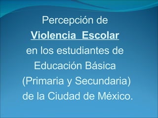 Este documento presenta un proyecto de investigación sobre la percepción de la violencia escolar entre estudiantes de educación básica en la Ciudad de México. El objetivo es analizar los discursos y representaciones de la violencia en niños y adolescentes de 8 a 15 años a través de entrevistas cualitativas. Se busca determinar los tipos de conductas violentas, los factores que influyen y las consecuencias, con la hipótesis de que los estudiantes enfrentan problemas de violencia escolar que afectan su desempeño académico