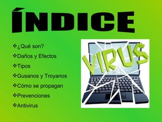 Este documento describe los virus informáticos, incluyendo su definición, tipos (virus, gusanos, troyanos), cómo se propagan (insertándose en otros programas y archivos), y los daños que pueden causar (modificación de datos, eliminación de datos). También recomienda medidas de prevención como mantener software antivirus actualizado y no compartir archivos de fuentes desconocidas. Los programas antivirus más populares mencionados son Norton, McAfee, F-Secure, Trend y Panda.