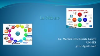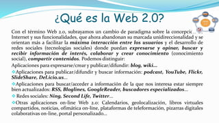 La Web 2.0 permite una mayor interacción entre usuarios y el desarrollo de redes sociales donde pueden expresarse, opinar y compartir contenidos. Incluye aplicaciones como blogs, wikis, YouTube, Flickr y SlideShare que permiten publicar, buscar y compartir información de manera colaborativa. Las características clave son la participación activa de los usuarios como contribuidores de contenido.