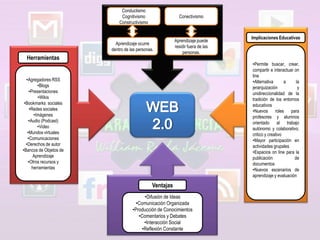 El documento describe las implicaciones educativas del constructivismo, conectivismo y la web 2.0, incluyendo nuevos roles para profesores y estudiantes enfocados en el trabajo autónomo, colaborativo, crítico y creativo. También señala herramientas como blogs, wikis y redes sociales que permiten buscar, crear y compartir información en línea, así como las ventajas de la difusión de ideas, comunicación organizada y producción de conocimientos a través de la interacción social y los comentarios constantes.