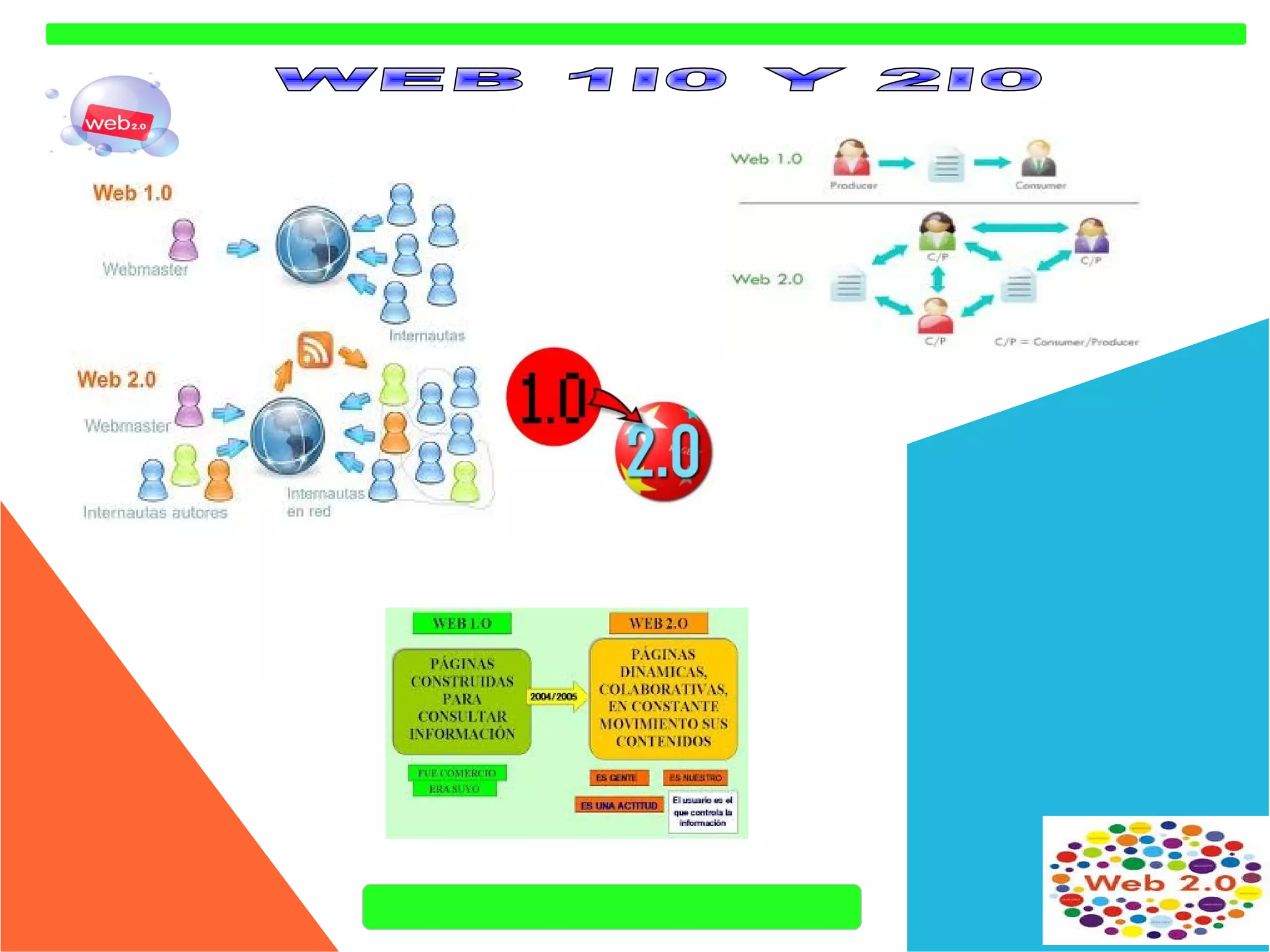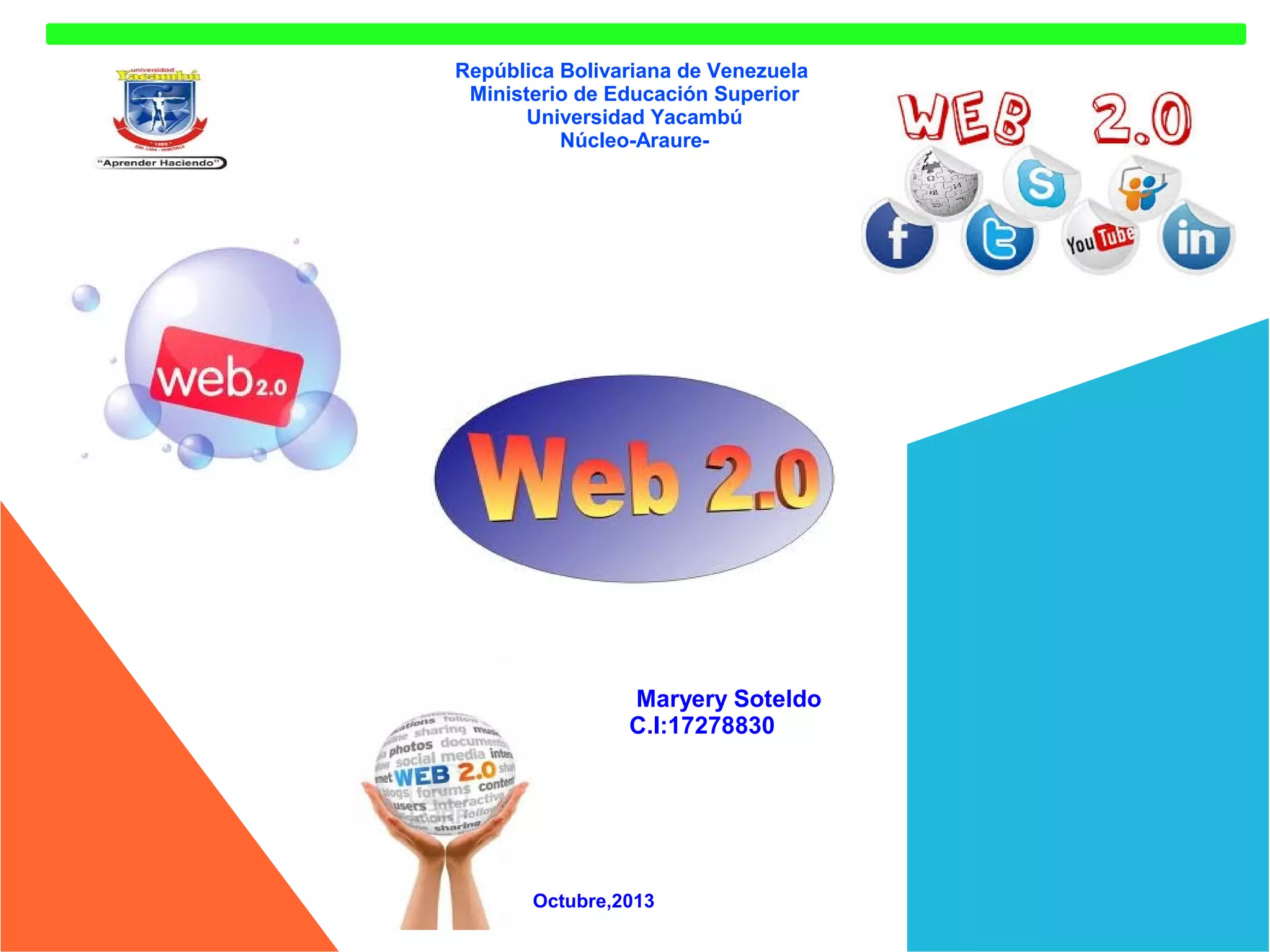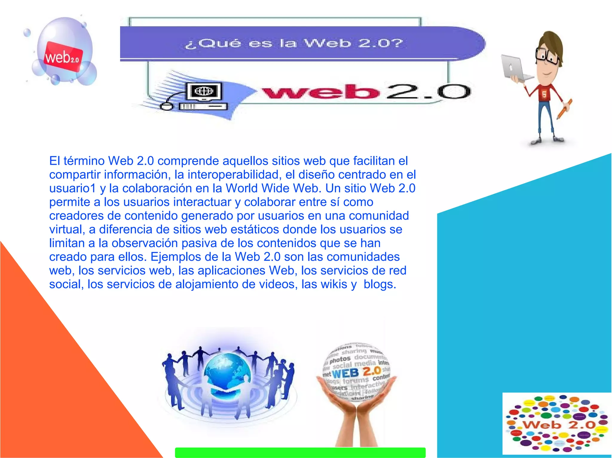El documento resume las características y ventajas de la Web 2.0, incluyendo su facilidad de uso, capacidades colaborativas, y habilidad para fomentar el aprendizaje constructivista. También discute algunos desafíos como la posibilidad de aislamiento y la necesidad de recursos técnicos. Divide las herramientas de la Web 2.0 en cuatro grupos: aplicaciones para compartir recursos, herramientas para crear recursos, servicios para recuperar información, y redes sociales.