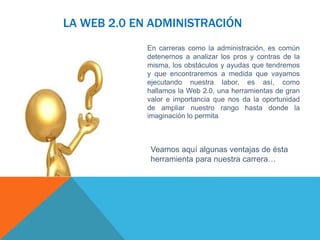 Este documento describe algunas ventajas de la Web 2.0 para las carreras de administración. La Web 2.0 permite acceder a información en tiempo real y actualizarla según sea necesario. También facilita compartir información, lo que es útil para capacitar al personal desde una perspectiva administrativa. En general, la Web 2.0 amplía el alcance de los administradores más allá de los límites tradicionales.