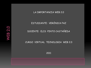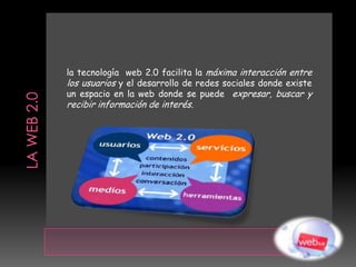 Este documento describe la importancia de la tecnología Web 2.0 para facilitar la interacción entre usuarios y el desarrollo de redes sociales. Explica que la Web 2.0 permite a los usuarios expresarse, crear contenido, buscar y compartir información a través de aplicaciones como blogs, wikis, podcasts y YouTube. También señala que la Web 2.0 hace que los estudiantes sean más autónomos en el acceso y construcción del conocimiento, pero requieren desarrollar competencias digitales como la búsqueda y procesamiento de