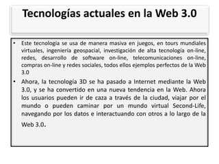 La Web 3.0 se refiere a la transformación de la Web en una base de datos inteligente impulsada por la inteligencia artificial. Algunas características clave incluyen el uso masivo de tecnologías 3D e interactivas en aplicaciones como juegos y mundos virtuales. La Web 3.0 también se caracteriza por aplicaciones web pequeñas y rápidas que pueden trabajar juntas y distribuirse fácilmente a través de redes sociales y mensajería.