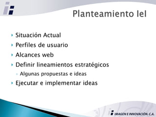 El documento habla sobre mejorar el sitio web de un ente del estado. Propone reorganizar la información, añadir más recursos fotográficos de Venezuela y determinar la información más importante para la página principal. También sugiere ejecutar una campaña para promover el turismo en Venezuela y mostrar que cualquiera puede viajar y disfrutar de los paisajes únicos del país.