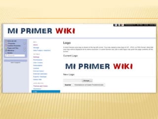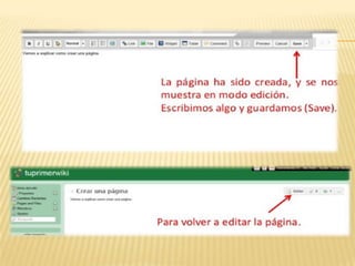 Este documento proporciona instrucciones sobre cómo crear y editar una wiki en Wikispaces. Explica cómo registrarse para obtener un nombre de usuario y contraseña, elegir un tipo de wiki básico, editar plantillas y detalles del sitio, y crear y editar páginas individuales. También advierte a los usuarios que verifiquen que estén registrados correctamente cada vez que accedan a la wiki.