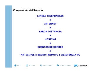 Este documento describe los servicios de telecomunicaciones, internet y asistencia informática ofrecidos por SCI a través de la tecnología WiMAX. Incluye 2 o 4 líneas telefónicas IP, minutos locales ilimitados, correo de voz, acceso a internet de hasta 1024 kbps, hosting web, cuenta de correo electrónico, antivirus o backup remoto, y asistencia técnica las 24 horas. Los servicios están disponibles en varias ciudades de San Luis, Mendoza y San Juan. El documento proporciona detalles sobre precios y caracterí