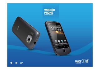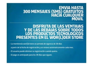 El documento proporciona información sobre una presentación de negocio de comunicaciones móviles llamada Wor(l)d. Detalla los horarios de las presentaciones, cómo los franquiciados e invitados deben ingresar, y brinda información sobre el CEO Fabio Galdi. También describe las ventajas del SoftSim de Wor(l)d, como comunicarse gratis globalmente, y las oportunidades de negocio como franquiciado virtual.