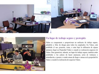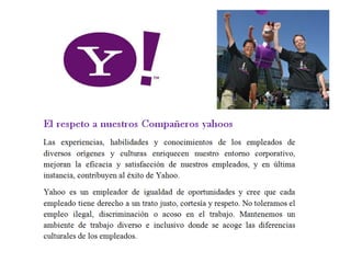 El documento resume la historia de la compañía Yahoo desde su fundación en 1994 hasta cambios recientes en 2013. Comenzó como un servicio de búsqueda en internet y se convirtió en una de las marcas más conocidas para 1999 con 185 millones de usuarios. En 2001, las acciones habían perdido valor y las ventas de publicidad se hundieron. En 2013, la nueva CEO introdujo cambios como eliminar productos no exitosos y actualizar el logo después de 18 años.