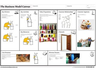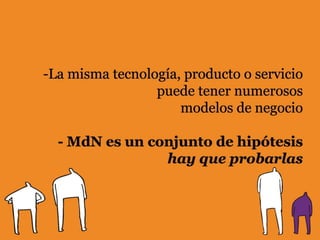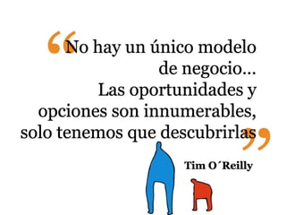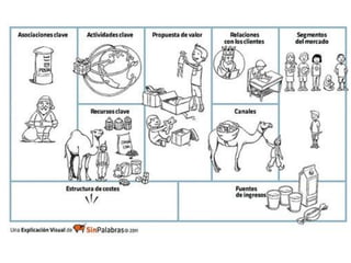 El documento habla sobre el libro "Business Model Generation Book" y describe los elementos clave de un modelo de negocio como recursos, actividades, costes, canales, flujos de ingresos, propuesta de valor, relación con clientes y segmentos de clientes. También menciona que los modelos de negocio pueden construirse a partir de diferentes perspectivas como los recursos, la oferta, el cliente, las finanzas o múltiples enfoques.