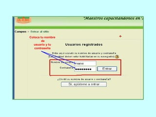 El documento proporciona instrucciones para ingresar al campus virtual de la universidad Munilosolivos.edu.pe. Indica que los usuarios deben ingresar la dirección web, luego escribir su nombre de usuario y contraseña para acceder a su espacio de aprendizaje. Dentro de este, pueden participar en foros de presentación y cursos específicos. También explica cómo configurar el perfil personal y cambiar la contraseña de acceso.