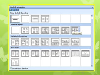 Este documento describe los diferentes tipos de diapositivas como diapositivas de tabla, diagrama, texto y multimedia. Explica cómo editar diapositivas cambiando el color de fondo, usando imágenes de fondo, editando texto y desplazándose entre diapositivas. También cubre los formatos de diseño de diapositivas y cómo insertar objetos, gráficos y tablas. Finalmente, discute la aplicación de efectos y animaciones, así como la presentación de diapositivas.