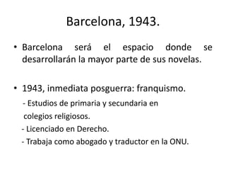 Este documento presenta información sobre la novela de Eduardo Mendoza "La verdad sobre el caso Savolta" y su contexto literario y social. En menos de 3 oraciones: La novela se publicó en 1975 durante la transición a la democracia en España y combina elementos experimentales con una trama más tradicional sobre el pistolerismo en Barcelona de 1917-1919. El documento también resume la novela corta de Mendoza "Sin noticias de Gurb" que narra las observaciones cómicas de un extraterrestre disfrazado que busca a otro alienígena perd