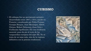 El cubismo fue un movimiento artístico pionero que surgió en Francia entre 1907 y 1914, fundado por Pablo Picasso, Georges Braque y otros artistas. Rompió con la perspectiva tradicional al representar objetos desde múltiples puntos de vista simultáneos mediante formas geométricas. Se desarrolló en fases analítica, hermética y sintética, incorporando collage. Fue influyente en otros campos como la literatura y la arquitectura.