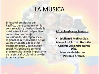 Este documento trata sobre la música, el carnaval, el baile y las tradiciones de la cultura afrocolombiana del Pacífico colombiano. Describe el Festival de Música del Pacífico y su misión de conservar y difundir la música tradicional de la región. También habla sobre danzas populares como el currulao, el carnaval como expresión cultural, y cómo el carnaval atrae turismo y promueve la cultura local.