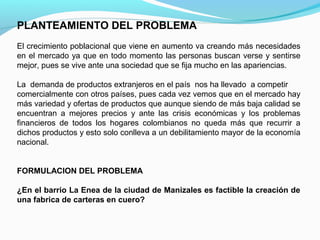 El documento presenta un estudio de factibilidad para crear una fábrica de carteras de cuero para damas en el barrio La Enea de Manizales. El estudio analiza la factibilidad técnica, administrativa, financiera y de mercado del proyecto. El objetivo es identificar si es viable crear la fábrica y comercializar las carteras para contribuir al desarrollo económico local y reducir el desempleo. El estudio concluye que es viable establecer la fábrica debido a que no hay competencia directa y existe