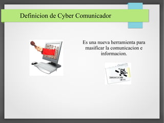 El documento define un cyber comunicador como una nueva herramienta para masificar la comunicación e información a través de la tecnología. Los cyber comunicadores permiten hacer periodismo desde cualquier lugar y que la información llegue más rápido. Sus características incluyen transmitir información a través de nuevas tecnologías de forma rápida, fácil y democrática. El documento concluye que los cyber comunicadores son una herramienta importante en la actualidad y que debemos prepararnos para usarla y mantenernos al día con la tecnología para informar de man