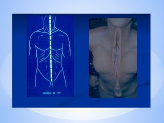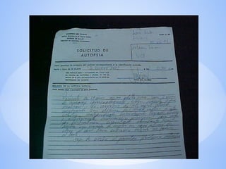 El documento aborda la historia y los procedimientos de la autopsia (o necropsia), detallando su evolución desde el siglo XIII hasta el siglo XIX, con énfasis en las técnicas utilizadas por médicos como Rudolf Virchow y Carl von Rokitansky. Se explican los objetivos, fases y tipos de necropsia, así como los signos de muerte y los procedimientos para el examen físico de los cadáveres. Finalmente, se destaca la importancia de la necropsia en la relación con el diagnóstico clínico y legal.