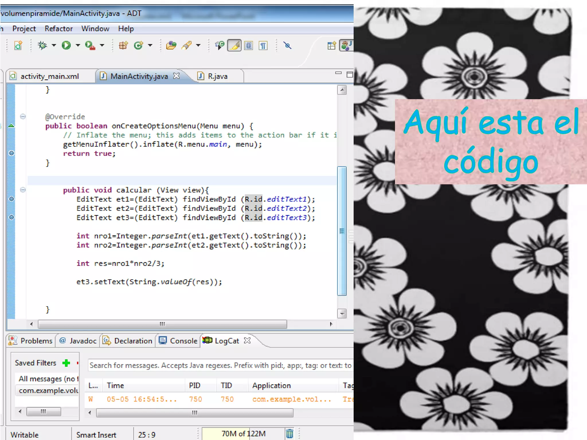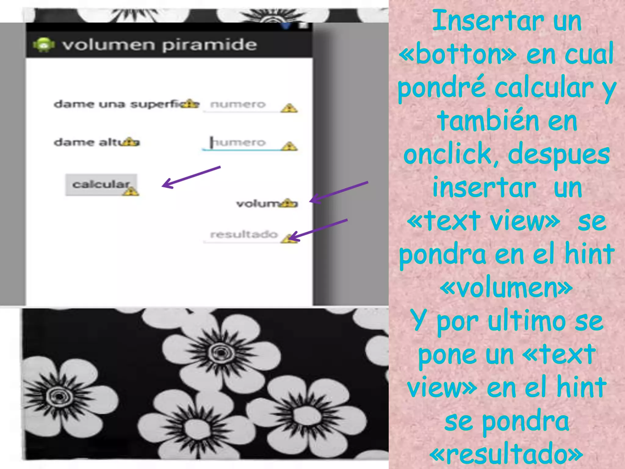 La alumna Jacqueline Janeth Martínez Ramos presentó un programa para calcular el volumen de una pirámide a su maestra Margarita Romero Alvarado. El programa multiplica y divide valores para determinar el volumen dividiendo el resultado final entre tres. La alumna opinó que el programa demuestra lo aprendido al desarrollar un emulador para calcular el volumen de una pirámide a través de multiplicación y división.