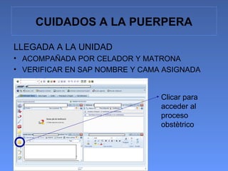 La puérpera llega a la unidad acompañada por personal, se verifica su identidad y se asigna una cama. En la habitación, el personal presenta la planta e informa a la puérpera, comprueba sus signos vitales, el útero, perineo y pérdidas, y coloca apósitos y drenajes si hubo cesárea. También se registra la puérpera en el sistema para dar seguimiento a sus cuidados.