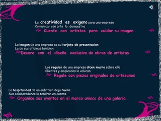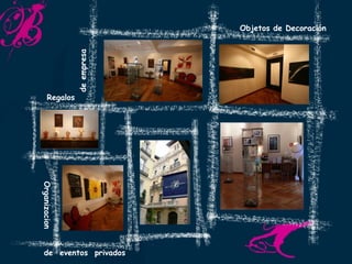 El documento habla sobre Mundo Boemia, una empresa que ofrece regalos y decoración con obras de arte y artesanía, así como la organización de eventos privados en su galería. Mundo Boemia trabaja con artistas y artesanos de diferentes países para proporcionar piezas únicas y personalizadas para empresas y particulares.