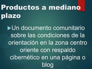 El documento propone crear una comunidad física y en línea de orientadores educativos para compartir recursos y apoyarse mutuamente, así como una página web para que los estudiantes exploren sus opciones educativas y hagan preguntas sobre temas psicológicos. Además, sugiere cursos de enlace entre padres, maestros y alumnos para discutir las fortalezas y oportunidades de los estudiantes.