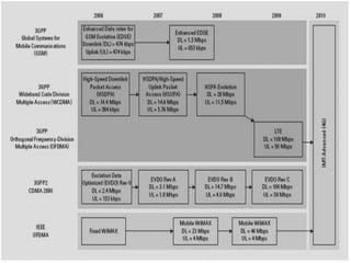 Este documento describe la evolución de las generaciones de telefonía móvil, desde 0G hasta 4G. Detalla los estándares, bandas de frecuencia y rendimientos de las generaciones 1G, 2G, 3G y 4G. Explica los requisitos para 4G, como acceso de banda ancha móvil, alta capacidad de red, conectividad entre redes heterogéneas y alta calidad de servicio. También resume el estado de las normas 4G de LTE y WiMAX.