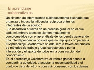 El documento describe el aprendizaje colaborativo como un sistema de interacciones diseñado para inducir la influencia mutua entre los miembros de un equipo a través de un proceso gradual de compromiso mutuo y dependencia positiva. Se caracteriza por el trabajo en grupo mediante la interacción y contribución de todos para construir conocimiento de forma conjunta. Sus elementos básicos incluyen la interdependencia positiva, la interacción cara a cara, la contribución individual y el desarrollo del pensamiento en grupo. Tiene ventajas como estimular habilidades personales y respons