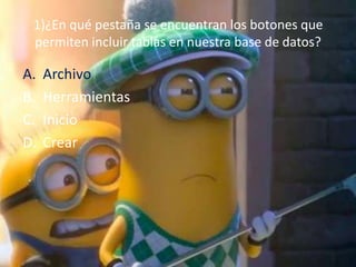Este documento contiene 10 preguntas sobre cómo crear y definir tablas en una base de datos. Las preguntas cubren dónde encontrar los botones para agregar tablas, cómo definir la estructura, los campos mínimos requeridos, las propiedades de los campos, las claves principales y su uso, los tipos de datos válidos y cómo cerrar una tabla. En resumen, proporciona información básica sobre la creación y configuración de tablas en una base de datos.
