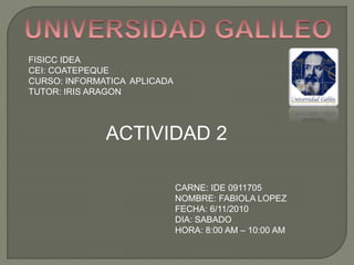 Este documento presenta tres presentaciones en PowerPoint sobre el uso de Outlook como herramienta administrativa, las características y versiones de Windows 7 y Office 2007/2010, e información sobre la Virgen María. Cada presentación cubre un tema diferente relacionado con el curso de Informática Aplicada.