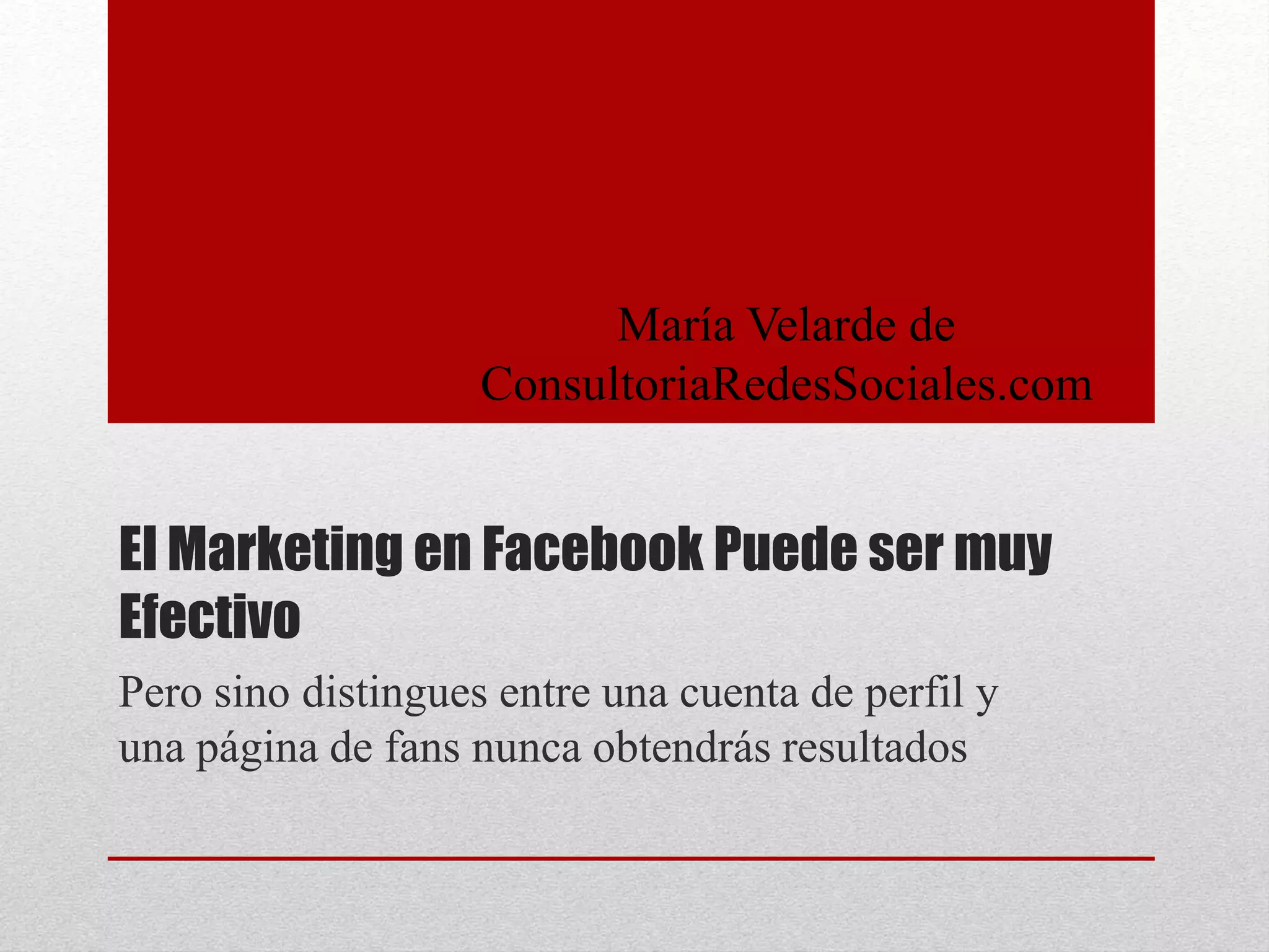 Este documento explica la diferencia entre una cuenta de perfil de Facebook y una página de fans, y por qué es importante usar una página de fans para promocionar un negocio en lugar de un perfil personal. Muchos emprendedores usan inicialmente su perfil personal para promover su negocio antes de darse cuenta de que una página de fans es más adecuada para este propósito. Una página de fans permite un alcance ilimitado y no requiere aprobación para que la gente la siga, a diferencia de un perfil personal con límites