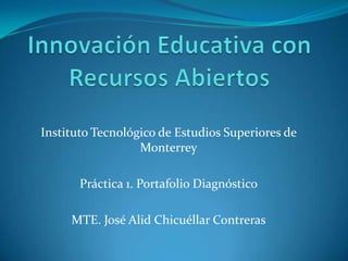 Este documento presenta el portafolio diagnóstico de José Alid Chicuéllar Contreras. Posee una maestría en Tecnología Educativa y ha tomado varios diplomados relacionados con la enseñanza y las herramientas digitales. Actualmente trabaja como facilitador en línea de Química y Física en el Instituto de Bachillerato en Línea de Veracruz. Ha diseñado la plataforma "Química en el Telebachillerato" para facilitar el aprendizaje de esta asignatura a través del