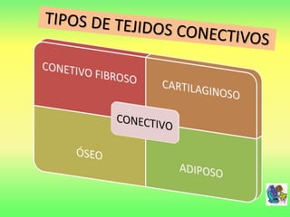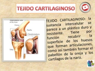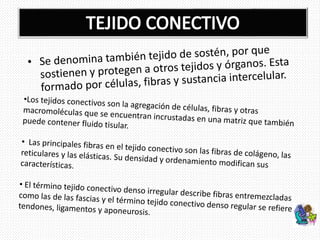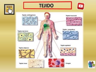 Este documento presenta información sobre los diferentes tejidos del cuerpo humano, incluyendo epitelial, muscular, nervioso, sanguíneo y conectivo. Explica que los tejidos se dividen en categorías como epitelio simple o múltiple, muscular esquelético, liso y cardíaco, y tejidos conectivos como fibroso, cartilaginoso, óseo y adiposo. Cada tejido cumple funciones importantes en el cuerpo como absorción, secreción, movimiento y protección.