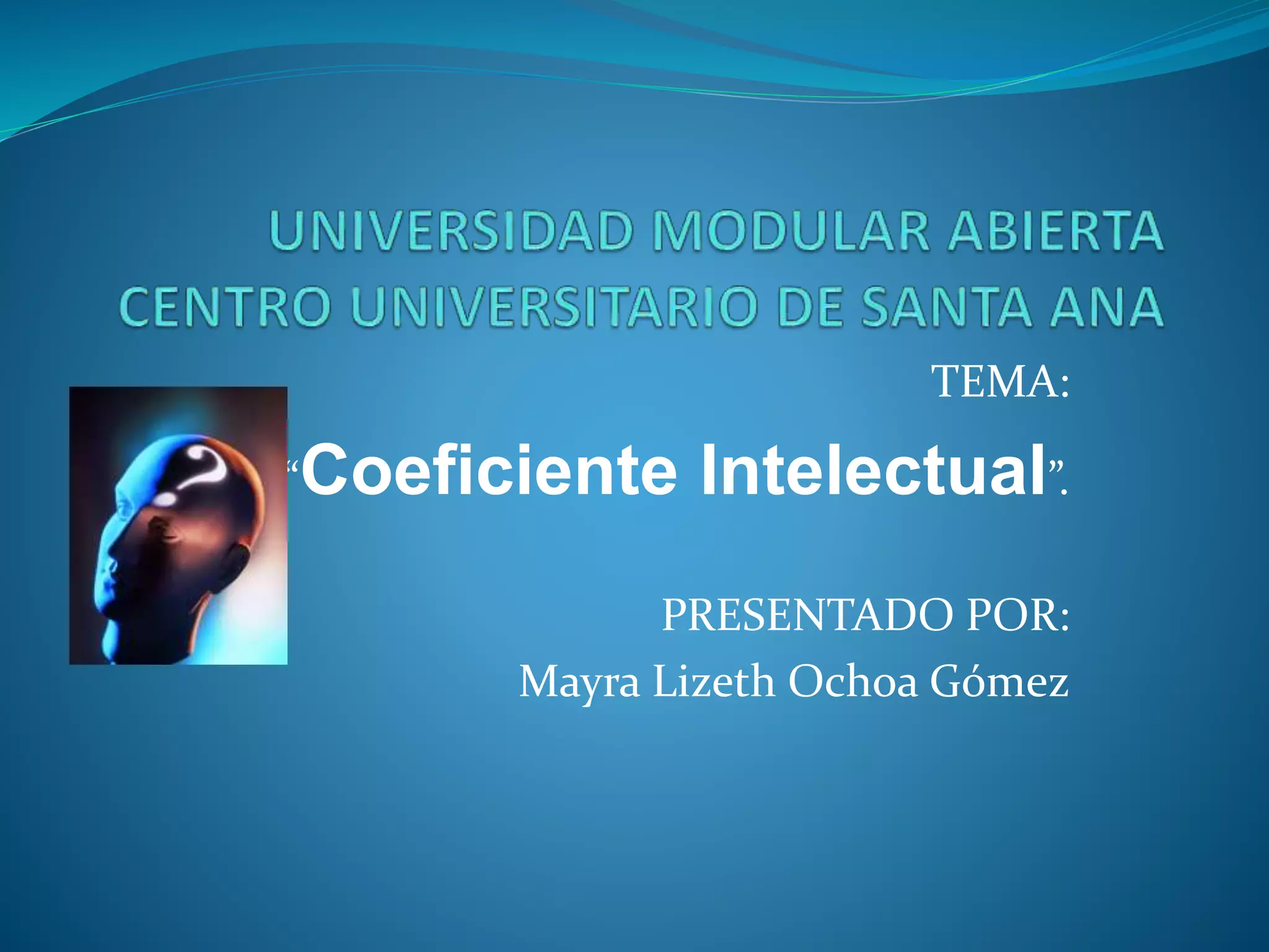 El documento habla sobre el coeficiente intelectual (CI). Explica que el CI es un número que resulta de un test estandarizado para medir las habilidades cognitivas de una persona en relación con su grupo de edad. Un CI de 100 se considera promedio, y superior a 98 se considera superdotado. Los tests de CI deben actualizarse constantemente para mantener los estándares. El documento también define habilidades cognitivas, tests, inteligencia y los diferentes tipos de inteligencia.
