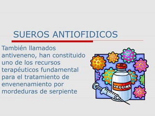 El documento describe los sueros antiofídicos, que han sido un recurso terapéutico fundamental para el tratamiento de mordeduras de serpiente. El primer suero antiofídico fue desarrollado por Albert Calmette en el Instituto Pasteur, mientras que Vital Brasil desarrolló los primeros sueros monovalentes y polivalentes para América del Sur y Central en 1901. Los sueros antiofídicos son soluciones salinas de inmunoglobulina equina purificada y se usan para neutralizar las toxinas de las mordeduras de serp