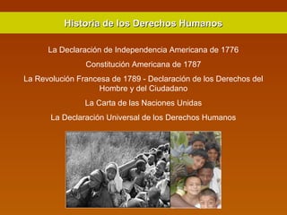 Este documento resume la historia de los derechos humanos desde las declaraciones de independencia de Estados Unidos y Francia en los siglos XVIII y XIX hasta la actualidad. Incluye hitos como la Declaración de los Derechos del Hombre y del Ciudadano de la Revolución Francesa, la Declaración Universal de los Derechos Humanos de las Naciones Unidas, y la clasificación de los derechos humanos en tres generaciones.