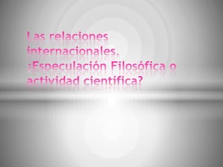 Las relaciones internacionales estudian la política exterior de los estados y sus interacciones, con el objetivo de mejorar el bienestar de las sociedades. Analizan factores como la historia, economía y estructuras políticas de los países. Surgen formalmente en 1648 con los tratados de Westfalia que establecieron la soberanía de los estados. Existen diversas teorías como el estructuralismo, funcionalismo y dependencia para explicar las dinámicas internacionales.