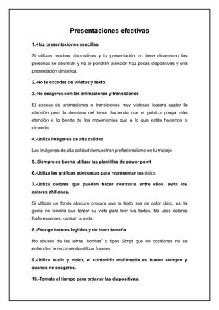 Este documento proporciona 10 claves para crear presentaciones efectivas con PowerPoint. Estas incluyen organizar la información en una diapositiva por tema, limitar el tiempo de exposición a menos de una hora, usar letras legibles y de buen tamaño con colores de contraste, seleccionar plantillas consistentes, y enfocarse más en el contenido que en el diseño. En resumen, el documento ofrece consejos prácticos para crear presentaciones claras, legibles y atractivas pero sin distraer del mensaje principal.