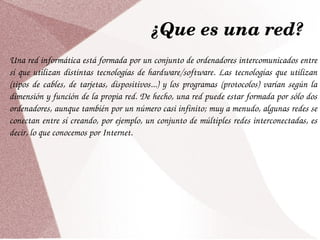 Una red informática conecta ordenadores que comparten recursos mediante protocolos de comunicación. Internet es la red global formada por redes interconectadas que usan el protocolo TCP/IP. Se originó en 1969 como ARPANET para conectar universidades del gobierno de EE.UU. y ahora conecta millones de dispositivos en todo el mundo, permitiendo compartir información de forma descentralizada.