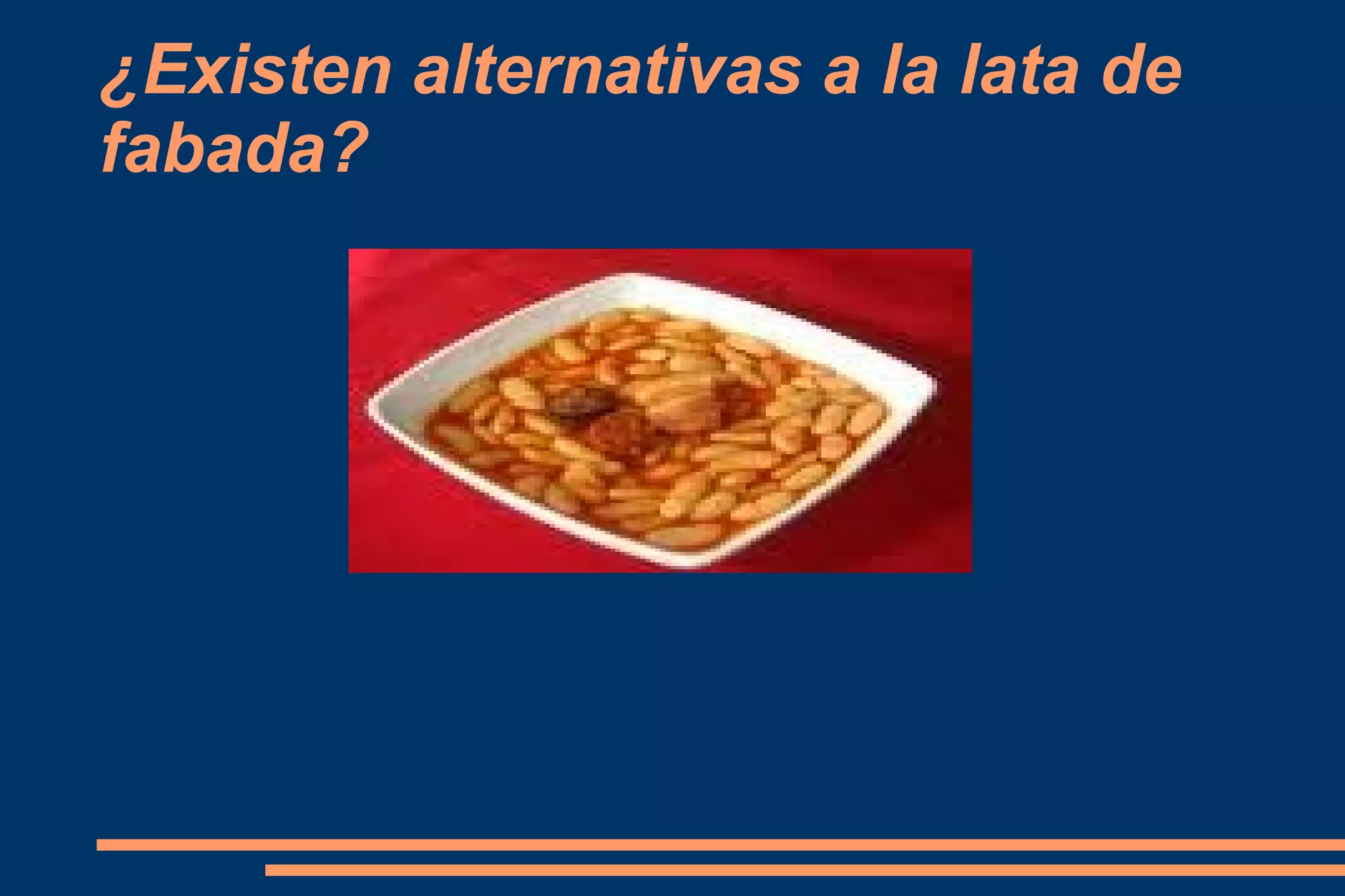 Este documento sugiere alternativas a la tradicional lata de fabada asturiana como entrada, incluyendo mejillones al vapor o foie de pato, y un buen jamón ibérico de postre. Se anima al lector a visitar un enlace web para encontrar más opciones culinarias y disfrutar de la comida.