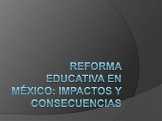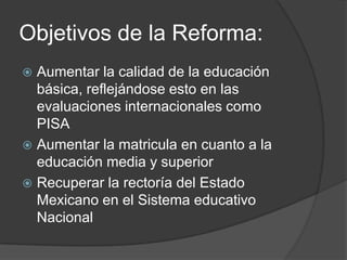 La reforma educativa tiene como objetivos aumentar la calidad de la educación básica, incrementar la matricula en educación media y superior, y recuperar la rectoría del Estado en el sistema educativo. Introduce un sistema nacional de evaluación, reforma el servicio profesional docente, otorga más autonomía a las escuelas, fortalece la gratuidad de la educación pública, y crea escuelas de tiempo completo con alimentación para los estudiantes.