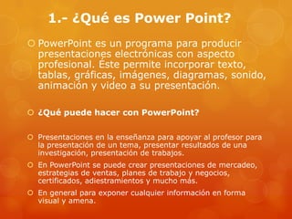 Este documento describe las funciones básicas de PowerPoint para crear presentaciones. Explica cómo crear una presentación nueva, agregar y diseñar diapositivas, aplicar temas y estilos de fondo, agregar animaciones y transiciones entre diapositivas, y visualizar la presentación. También cubre cómo guardar y abrir presentaciones existentes.