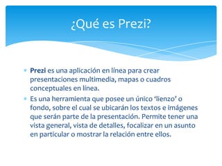 La presentación describe las funciones básicas de Prezi, una herramienta en línea para crear presentaciones multimedia interactivas. Prezi utiliza un único lienzo sobre el cual se colocan textos e imágenes. Permite ver detalles o una vista general y cambiar el enfoque. Para crear una presentación en Prezi, se elige un título y plantilla y se agregan elementos como texto, imágenes, videos y marcos conceptuales. Las presentaciones se pueden ver, editar, descargar y compartir desde la página de inicio de Prezi.