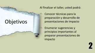 Este documento proporciona reglas y consejos para preparar presentaciones efectivas. Explica que una presentación efectiva es un discurso breve que expone los puntos clave de un tema. Luego, ofrece sugerencias sobre la planificación, el diseño, el contenido y la entrega de las diapositivas para captar la atención de la audiencia y transmitir el mensaje de manera clara y concisa.