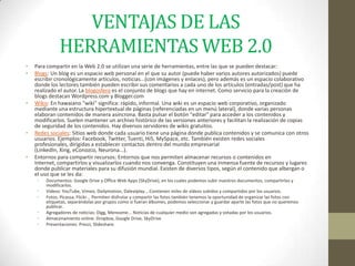 Este documento describe las herramientas de la Web 2.0, que permiten compartir información y colaborar entre usuarios como creadores de contenido. Estas herramientas incluyen blogs, wikis, redes sociales, y entornos para compartir recursos como videos, fotos y documentos. Aunque la Web 2.0 ha democratizado la publicación de información, también ha aumentado la segmentación del contenido disponible.