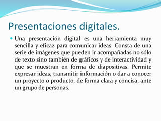 Una presentación digital es una herramienta eficaz para comunicar ideas a través de diapositivas que incluyen texto, gráficos e interactividad. Las presentaciones multimedia se crean usando programas como PowerPoint e Impress y permiten exponer temas ante un auditorio de forma clara y estructurada, facilitando la retención de la información presentada. Las presentaciones digitales pueden incluir diferentes elementos multimedia y tienen utilidad para explicar proyectos o productos.