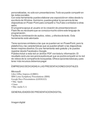 Una presentación digital es una herramienta para comunicar ideas de forma clara y concisa ante un grupo de personas mediante diapositivas con texto, imágenes, videos y audio. Existen varias aplicaciones para crear presentaciones digitales de forma gratuita o con planes de pago, como PowerPoint, Impress y Google Docs. Las presentaciones digitales facilitan la exposición de temas ante audiencias y proveen una estructura fácil de seguir.