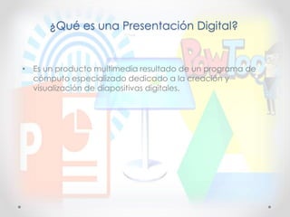 Este documento describe diferentes programas para crear presentaciones digitales como alternativas a PowerPoint. Prezi y Emaze son dos opciones populares que permiten crear presentaciones interactivas con animaciones y efectos utilizando plantillas gratuitas. Impress.js es una herramienta para presentaciones que utiliza HTML, CSS y JavaScript pero requiere conocimientos de codificación. PowerPoint sigue siendo una de las herramientas más utilizadas para crear presentaciones multimedia profesionales en diversos campos.